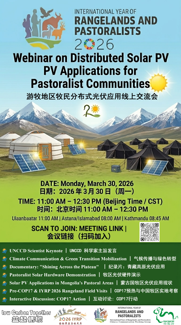 On behalf of Green Camel Bell (UNCCD Observer & IYRP 2026 NGO Partner), we are honored to invite you to our international webinar of Distributed Solar PV Applications for Pastoralist Communities celebrating the International Year of Rangelands and Pastoralists (IYRP 2026). This webinar focuses on decentralized renewable energy solutions and their role in empowering nomadic communities across the Tibetan Plateau and the Mongolian Steppe.