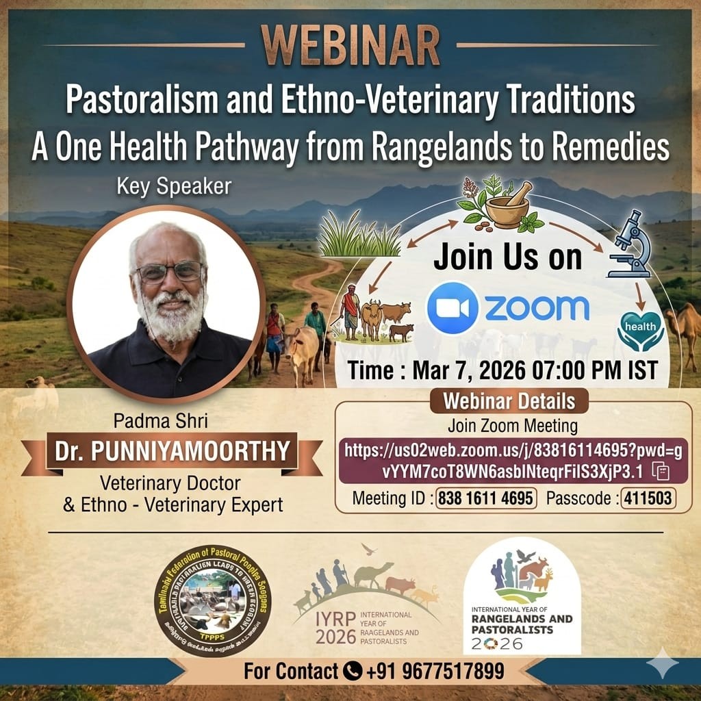 This webinar is being organised as part of the International Year of Rangelands and Pastoralists (IYRP 2026). The session will focus on the vital role of pastoral systems, indigenous ethno-veterinary knowledge, and the One Health approach connecting rangelands, livestock, biodiversity, and human well-being. The keynote speaker is Padma Shri Dr. Punniyamoorthy, a distinguished Veterinary Doctor and Ethno-Veterinary Expert from India. Through this event, we aim to strengthen awareness on pastoral rights, traditional knowledge systems, and sustainable livestock practices in Tamil Nadu and across India.