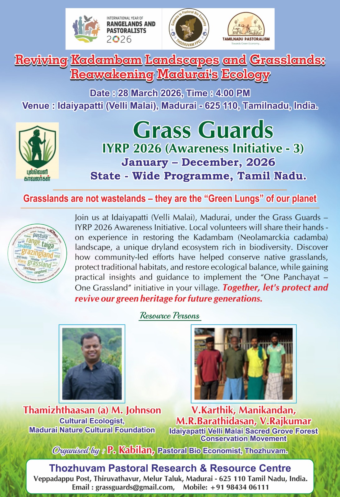 The programme will be held on 28 March 2026 at 4:00 PM at Idaiyapatti (Velli Malai), Madurai – 625110. It will feature field-based interactions, knowledge-sharing sessions by local conservation volunteers, demonstrations of grassland restoration techniques, and interactive discussions to foster community-led ecological stewardship. Key resource persons include Thamizhthaasan (M. Johnson), Cultural Ecologist, along with local conservation leaders — V. Karthik, Manikandan, M.R. Barathidasan, and V. Rajkumar — from the Idaiyapatti Velli Malai Sacred Grove Forest Conservation Movement.