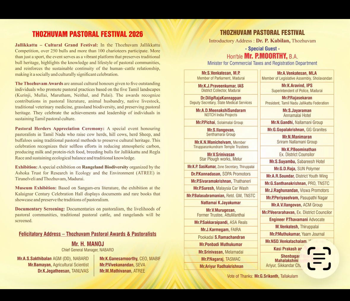 In the context of the International Year of Rangelands and Pastoralists (IYRP), the Thozhuvam Pastoral Festival 2026, to be held on Saturday, 21 February 2026 at the Kalaignar Centenary Jallikattu Arena, Madurai, Tamil Nadu, India, is being organized by the Thozhuvam Pastoral Research and Resource Centre and Thozhuvam Farmer Producer Company Ltd., with the objective of recognizing and honouring traditional pastoral communities who sustainably manage rangelands and preserve indigenous livestock heritage.