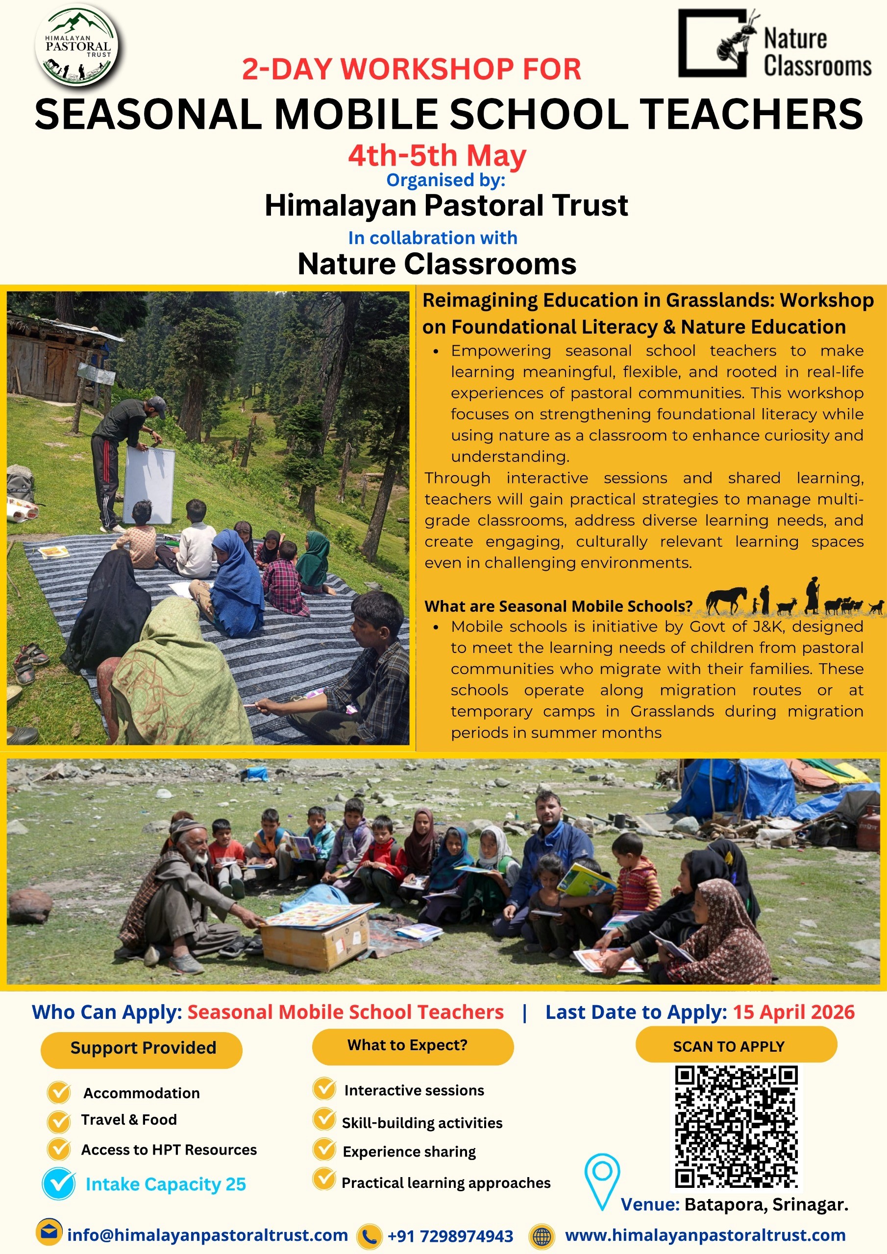 The Himalayan Pastoral Trust is pleased to share that Himalayan Pastoral Trust, in collaboration with Nature Classrooms, is organising a Capacity Building Workshop on Foundational Literacy & Nature Education for seasonal mobile school teachers in Kashmir. The workshop will focus on strengthening teaching practices in pastoral contexts through practical, nature-based and context-relevant approaches, particularly for multi-grade classrooms and mobile learning environments.
