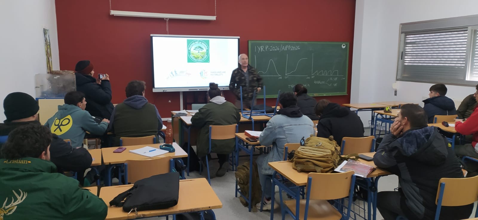 This was the first talk of the year and the first activity organised since the creation, on 6 January, of the Pastos de la Sierra Observatory, a local, non-profit initiative based in Cazalla de la Sierra (Seville, Spain). The activity took place at Instituto El Carmen (Cazalla de la Sierra), with students from the Higher Vocational Training Programme in Forest Management (approximately 20 students and 2 teachers). It consisted of a technical classroom session —where the International Year and the Observatory were introduced, followed by a talk on key aspects of dehesa grasslands— and a subsequent field visit to a nearby plot. During the fieldwork, participants focused on identifying the type of grassland, assessing its phenological stage, recognising the species present, and observing the effects of livestock management. Student participation was very active, and the teaching staff have expressed their interest in giving continuity to this collaboration through future activities.