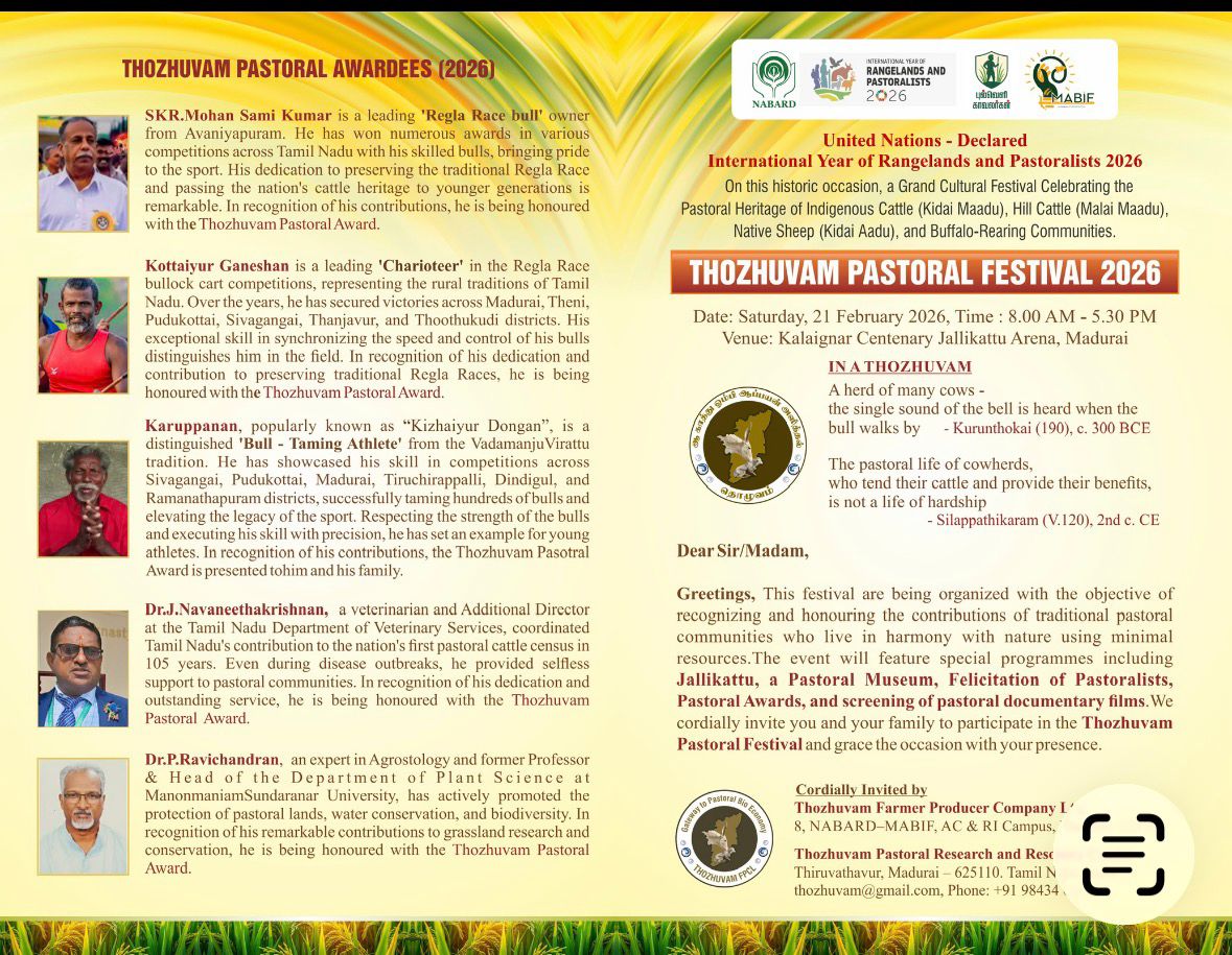 In the context of the International Year of Rangelands and Pastoralists (IYRP), the Thozhuvam Pastoral Festival 2026, to be held on Saturday, 21 February 2026 at the Kalaignar Centenary Jallikattu Arena, Madurai, Tamil Nadu, India, is being organized by the Thozhuvam Pastoral Research and Resource Centre and Thozhuvam Farmer Producer Company Ltd., with the objective of recognizing and honouring traditional pastoral communities who sustainably manage rangelands and preserve indigenous livestock heritage.